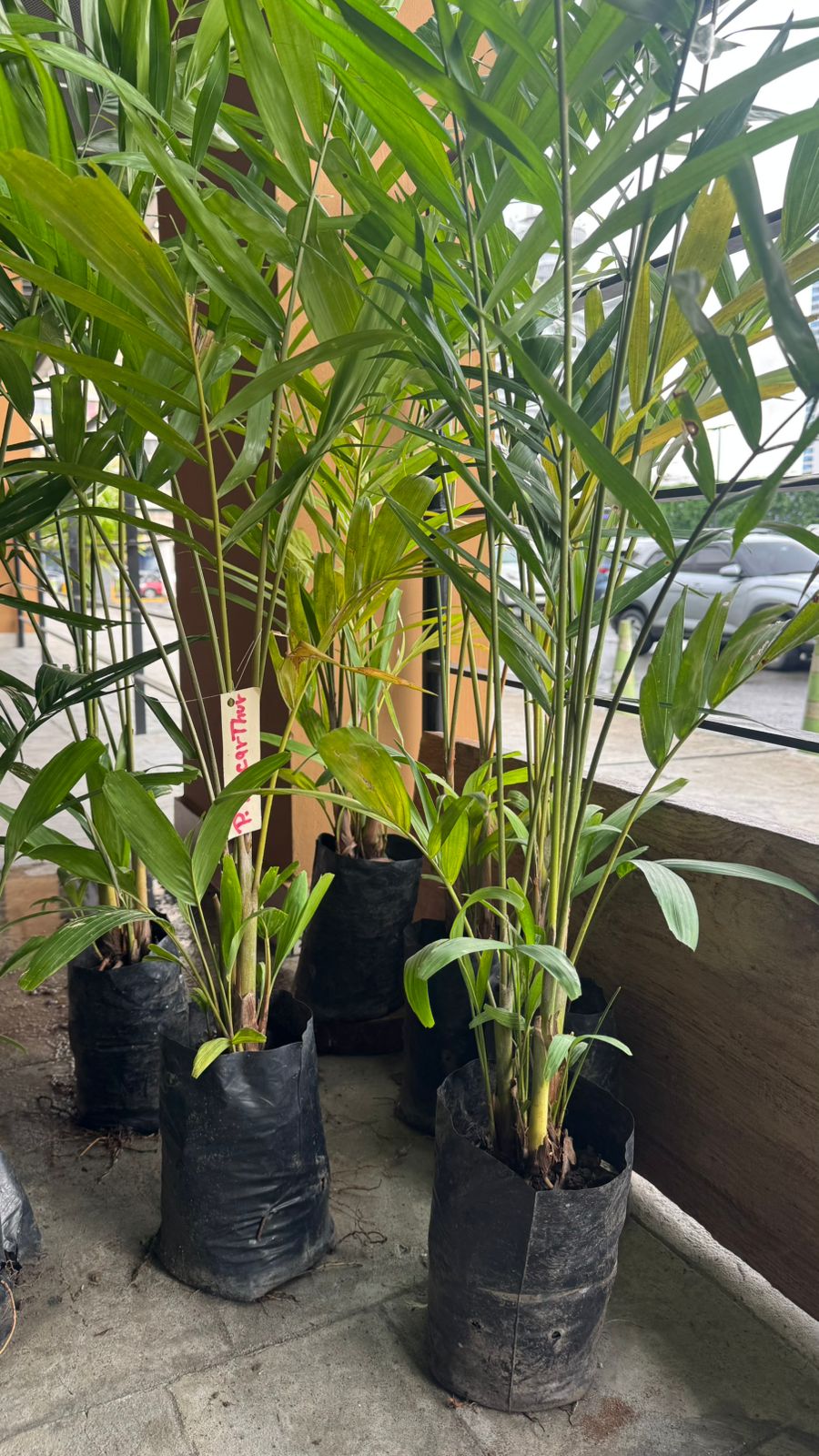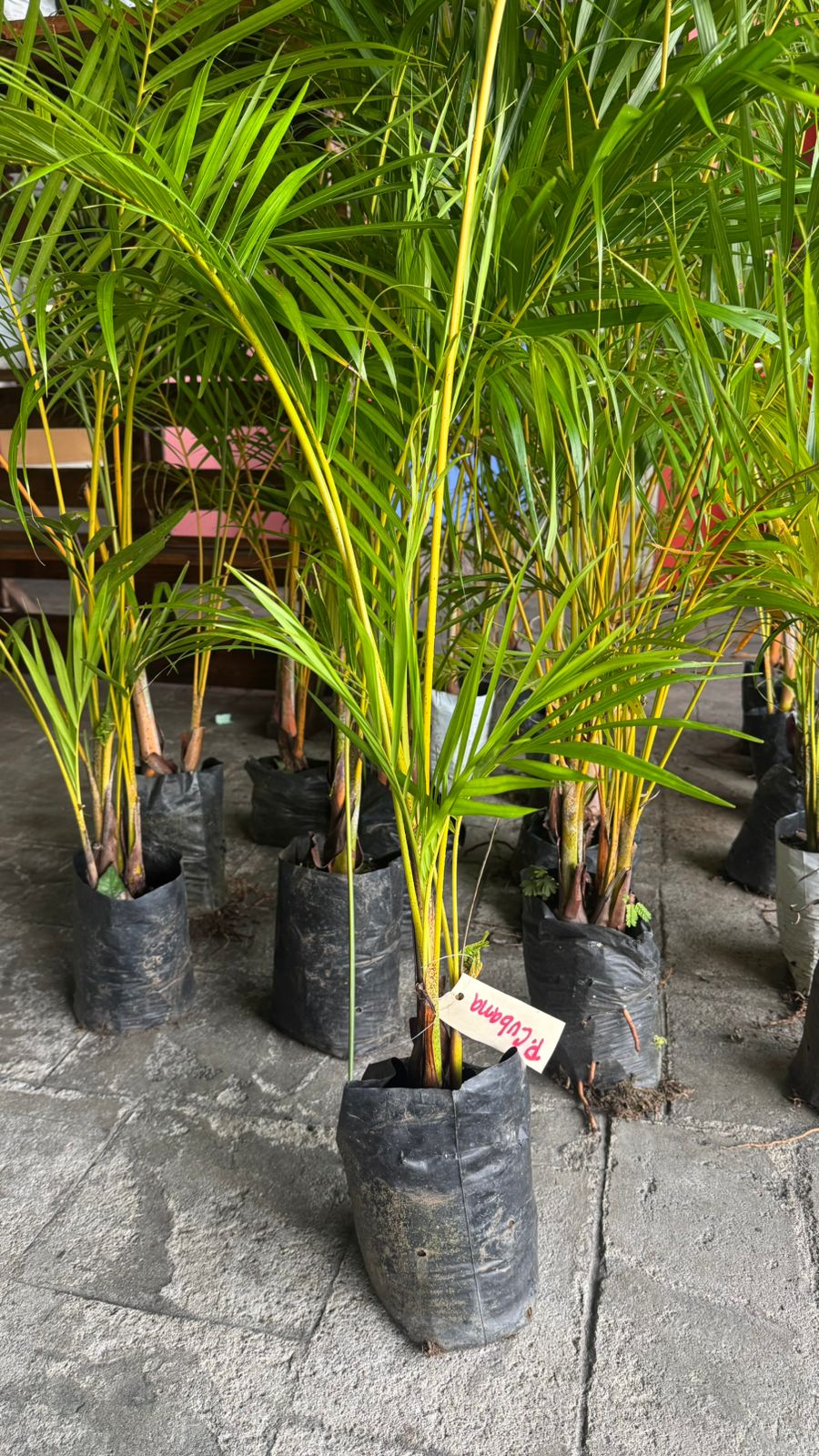 Palma ornamental de varios tallos y hojas finas, muy usada en jardines y áreas sombreadas. Prefiere semisombra, riego constante y suelos húmedos pero bien drenados.